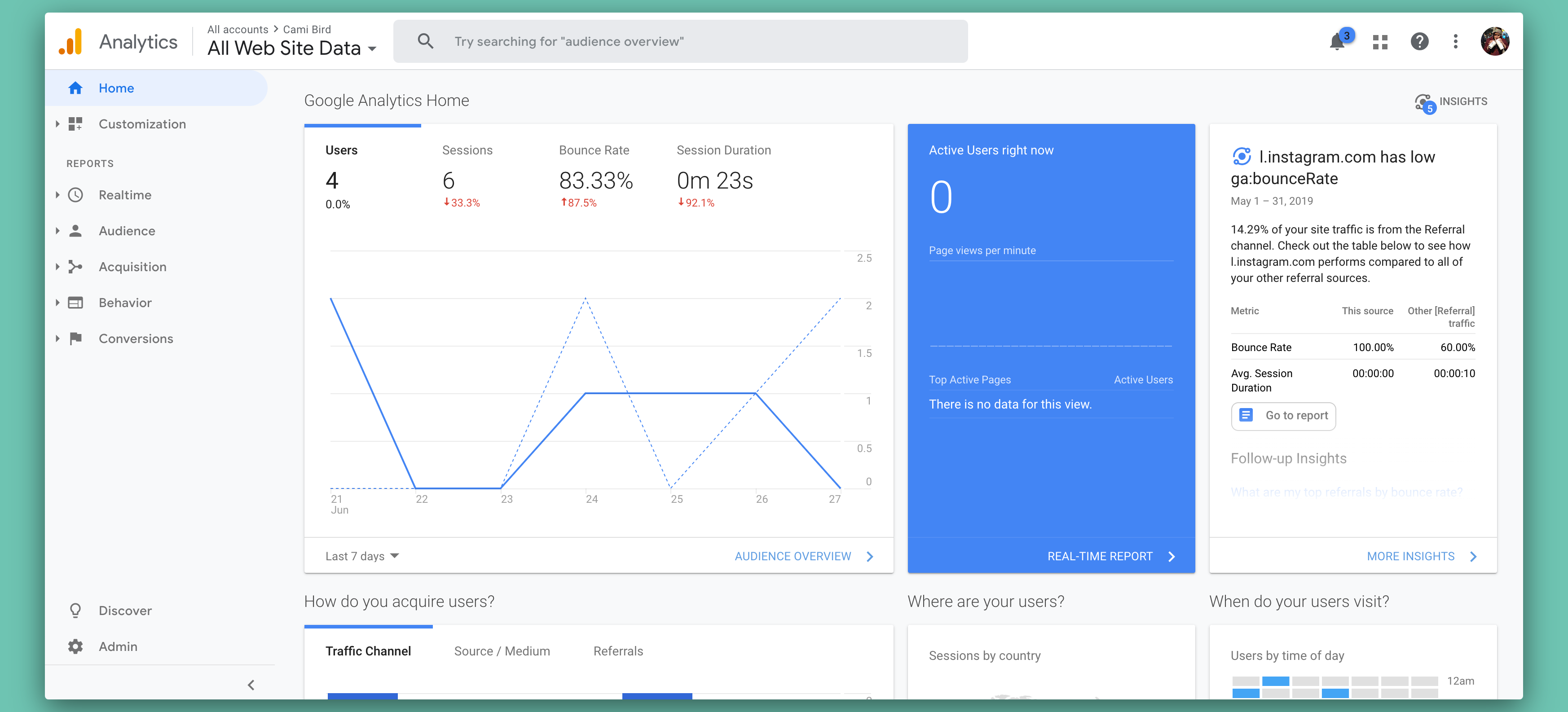 You'll see a dashboard for "All Web Site Data" and your preview data will all be zero - because you haven't started tracking anything yet!