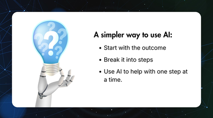 AI doesn’t feel overwhelming because it’s complex. It feels overwhelming because there’s no clear starting point. A simpler way to use AI is this: Start with the outcome Break it into steps Use AI to help with one step at a time. That’s it. Where Thi...
