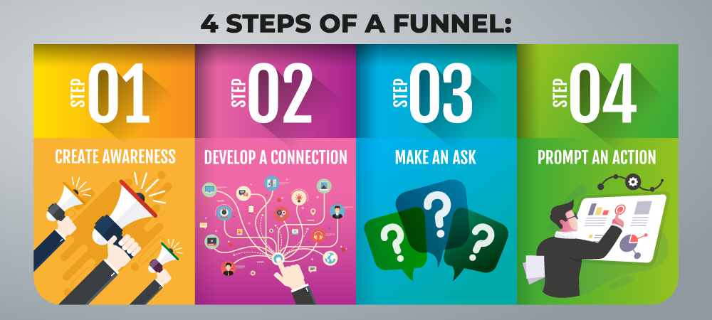 It’s called a “funnel” to represent the process of communication and interaction you take with every prospective customer. The wide mouth top of the funnel is the broad part of the process, developing awareness and interest. As the funnel narrows, your potential customer travels through different interactions and decisions to ultimately end at the bottom of the funnel where the final action takes place and you make a sale.