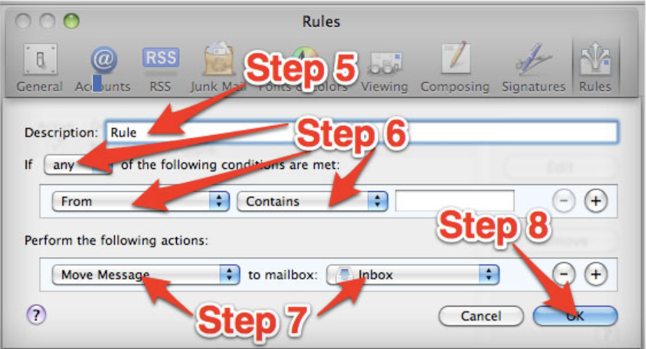 5. In the “Rules” window, type a name for your rule in the “Description” field.