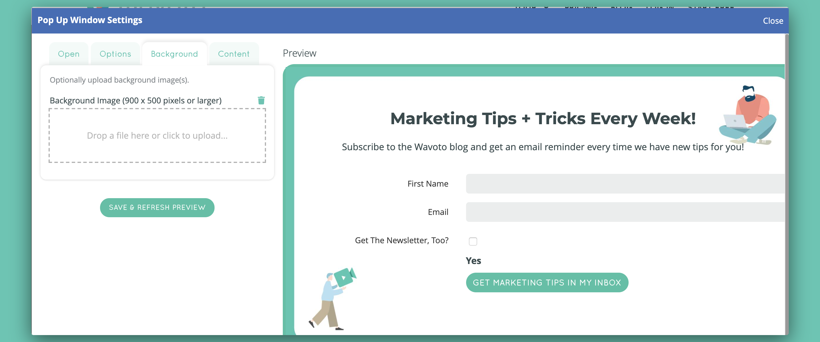 We added the ability to add background images to your pop-ups. It's as simple as dragging and dropping a 900 x 500 pixels or larger image into your pop-up setting. Whether you add a graphic, an image, or just a border color to your pop-up, you now have even more customization options!