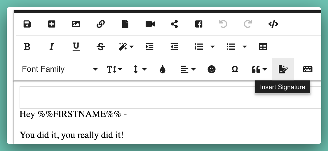 Use your email signature a lot in your marketing? We've got you covered! No more copy and pasting your email signature from one email to another, now it's a simple click of a button away! All you need to do is add it to your account and then when you're writing your emails, click the signature button in the text editor!