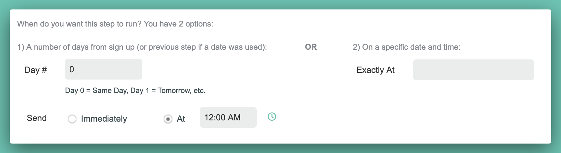 When you create a new autoresponder email you'll now see the option to send an email based on the day someone signed-up (or was tagged) to receive the autoresponder or on a specific date and time, no matter when they signed up!