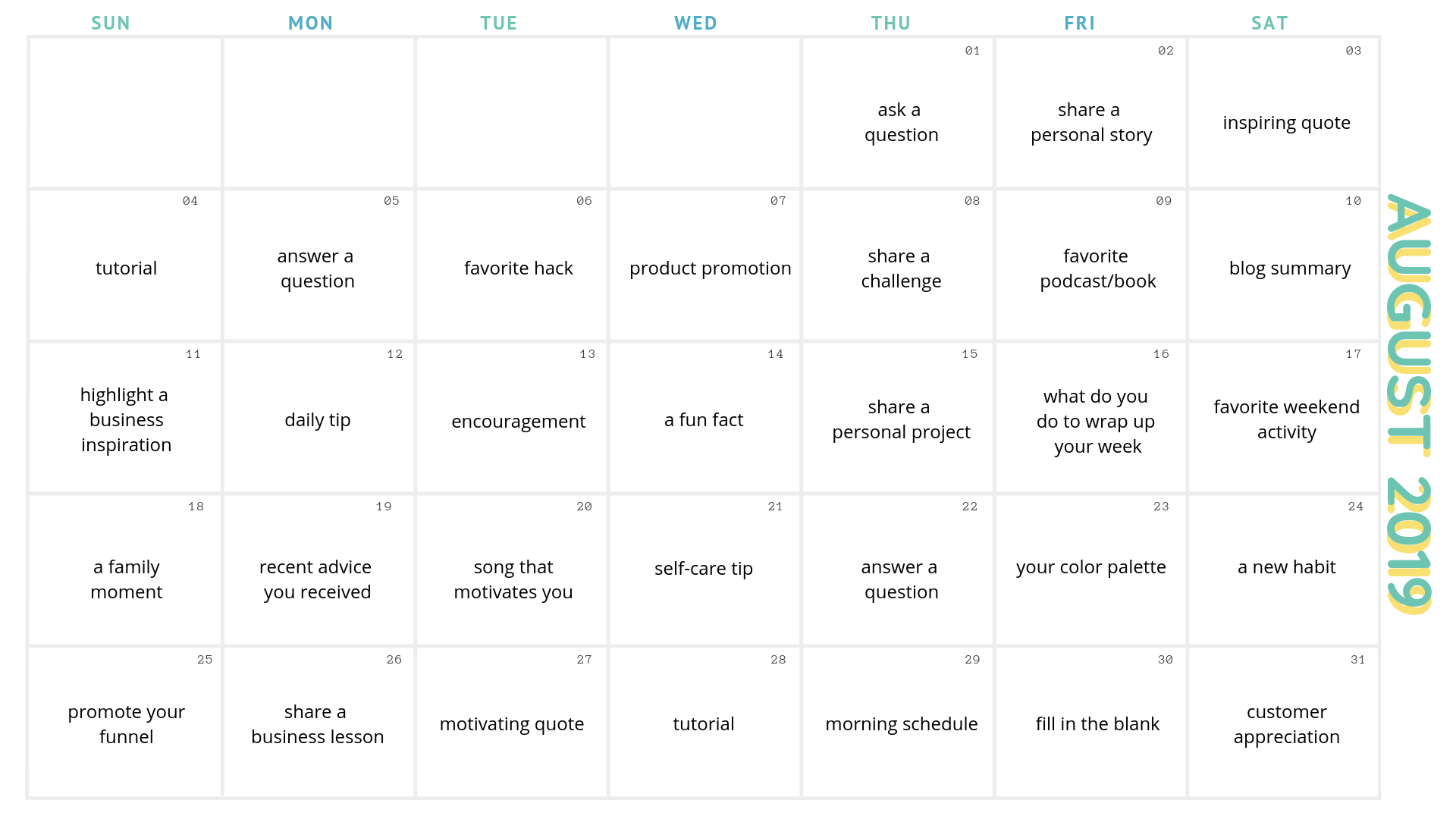 We've put together social post ideas for the entire month of July and August so you can schedule out your social posts and take some time on the beach (or have more time for your business). You can use our social post ideas for every single day of July and August or pick and choose what you like when you like!